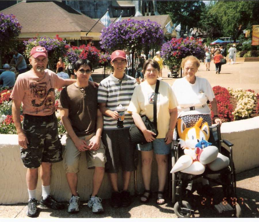 Al, Andrew, Eric, Nancy, Irma Bruhn (Irma Kessler) June 21, 2007 outside German Hall, Busch Gardens