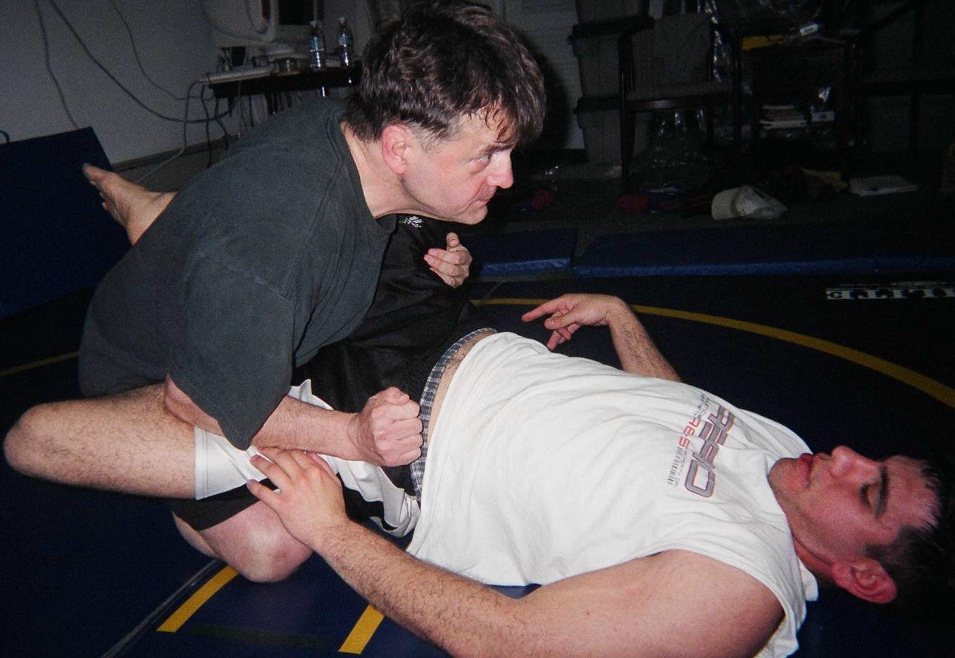 Since Al and Justin are trained in scholastic wrestling, Barrett and Ehson started the first official session with instructing submission grappling techniques from the guard position. The guard position is the position after the takedown from the neutral or standing position. It involves one grappler on his back with his legs wrapped around the opponent, while the opponent stands tall and plans his next move. It is vital to know what to do here, as this is where the chess match truly begins.