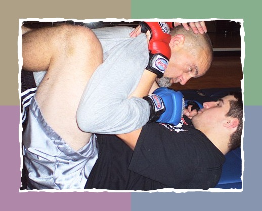 Bruhn in Rinaldi's guard during Mixed Martial Arts training at Ridgefield Recreation Center.