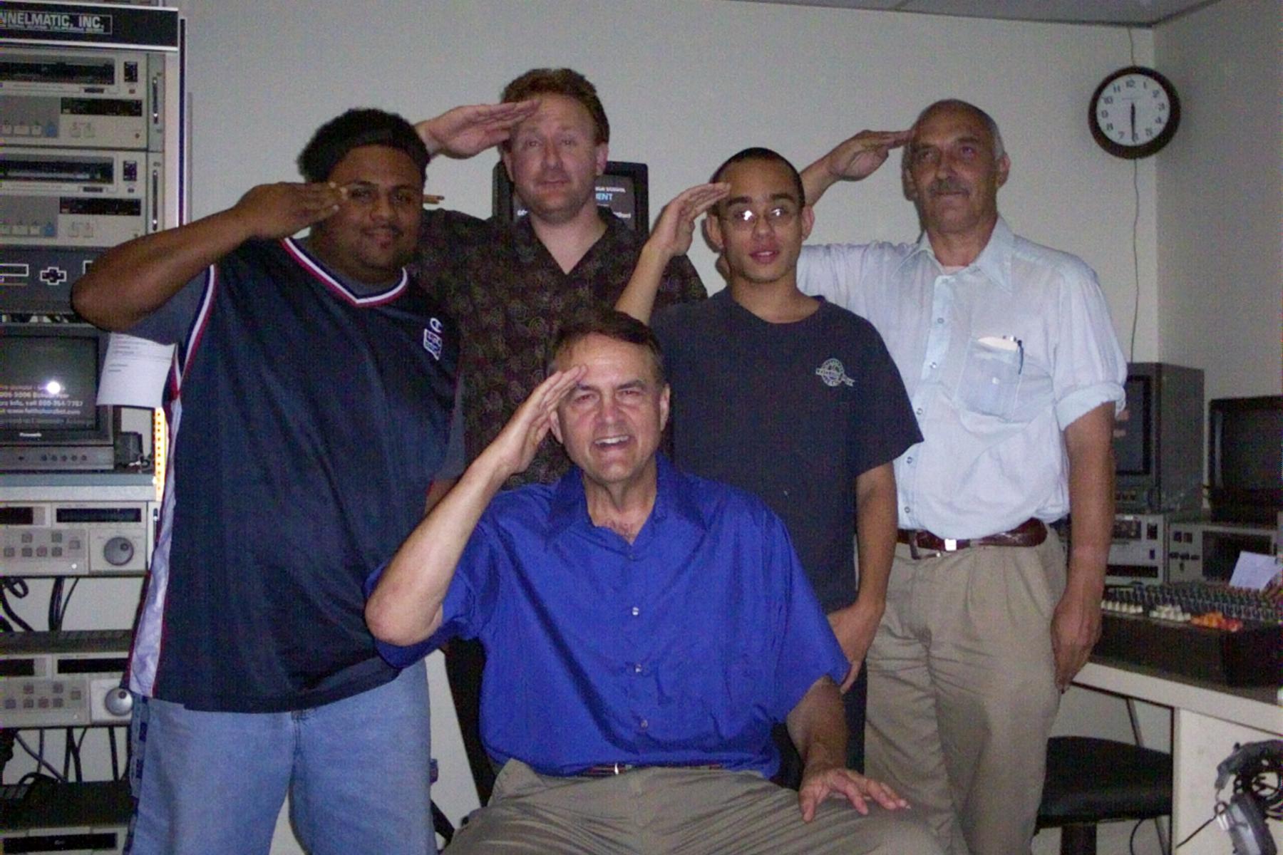 Ridgefield resident Al Bruhn seated salutes his faithful TV audience in front of