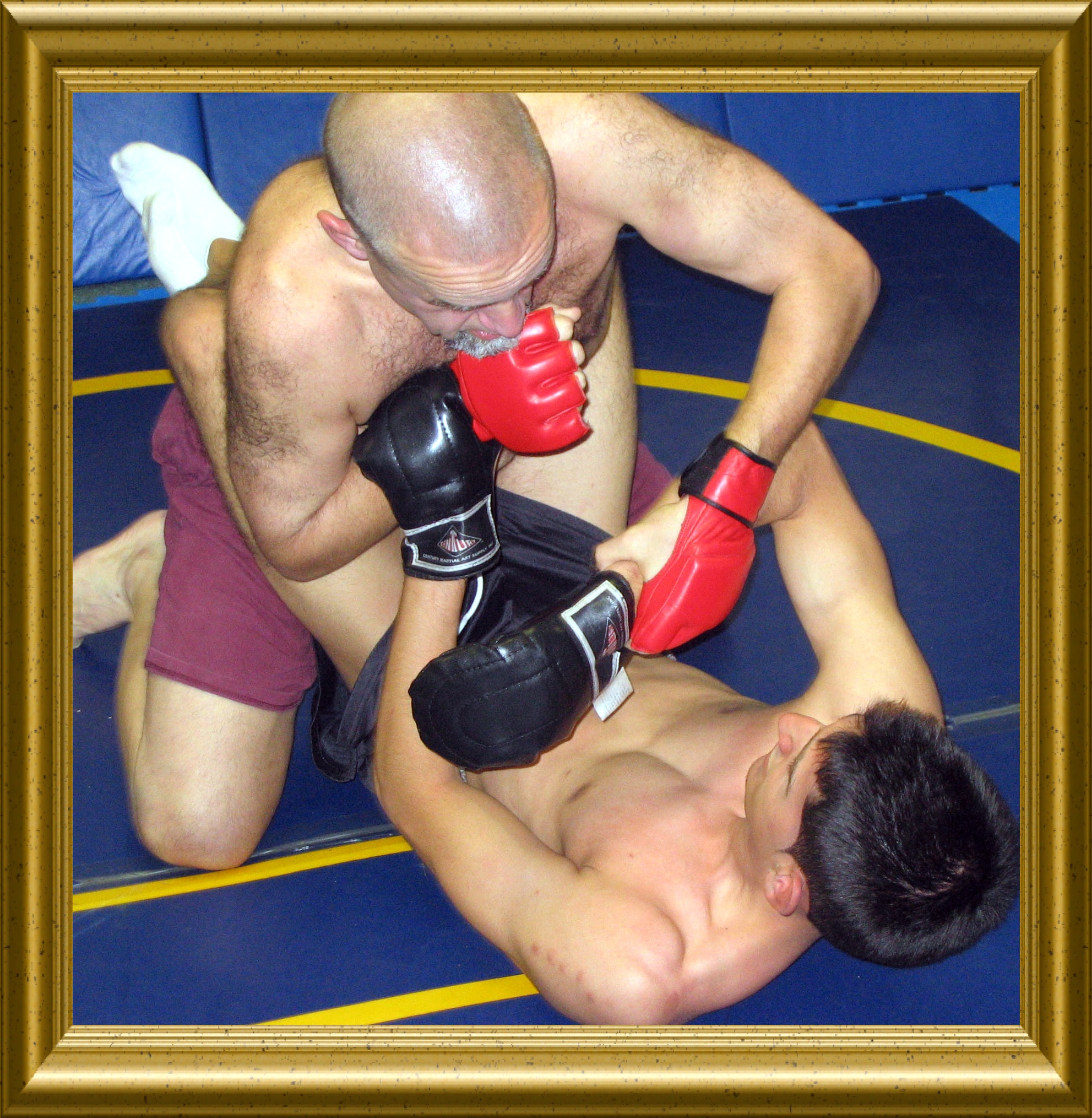 With no referee in the ring and a four minute time limit, Al Bruhn in black gi uniform with fighter gloves faced Vincent Argese in shorts and tee shirt with word Terror on it and fighter gloves. Pankration is submission grappling including boxing. It�s 9:45pm and the spectators are watching with questionable anticipation as to what to expect of a senior grappler against a high school grappler. Max and Eric Bruhn were in Al's corner and Carmel High School students were in Vincent's corner. Al noticed fresh blood on the canvas in the ring. But, that didn�t deter Al�s fight with Vincent. Their gloves met in a friendly chester to signal the start of the Pankration match.